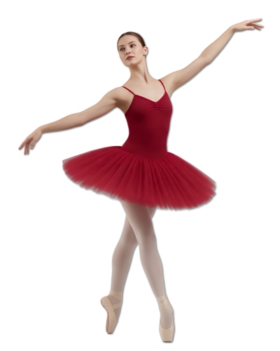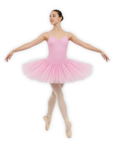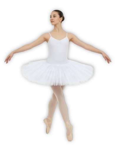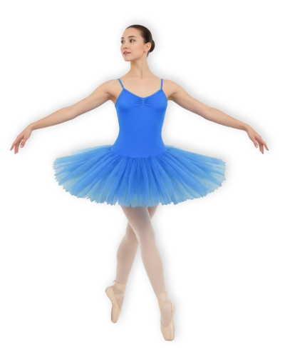 Short tutu with 6 layers of rigid tulle on lycra bodysuit with thin straps, straight back neckline, gathered brast, linedc forward
