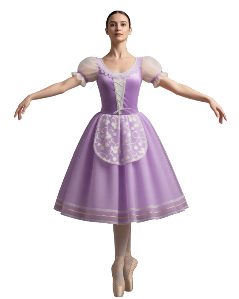 Costume composto da una gonna in tulle applicata su un bustino in lycra ( a richiesta velluto) con stringhe e parte superiore in contrasto per un effetto camiciola rafforzato dalle maniche in velo. Si presta bene a scene del popolo o agresti. Realizzabile in diverse combinazioni di colori