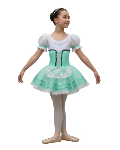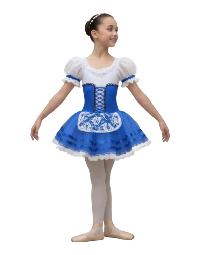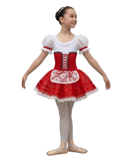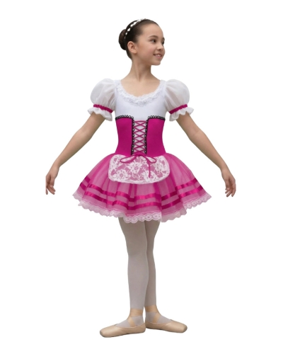 Costume composto da gonna con nastri , bustino effetto corpetto e inserto bianco con stringhe ; maniche a palloncino con nastri, grembiulino in pizzo