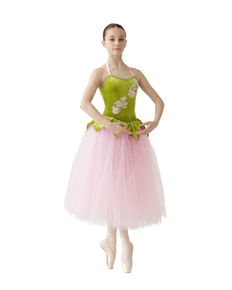 Tutù lungo con corpetto in velluto con applicazioni floreali e gonna in tulle
